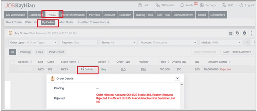 Trade confirmation alerts are only indicative tools and are not guaranteed. Clients should always check their order status in their Order Book page.